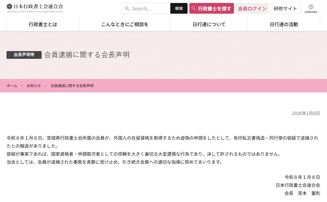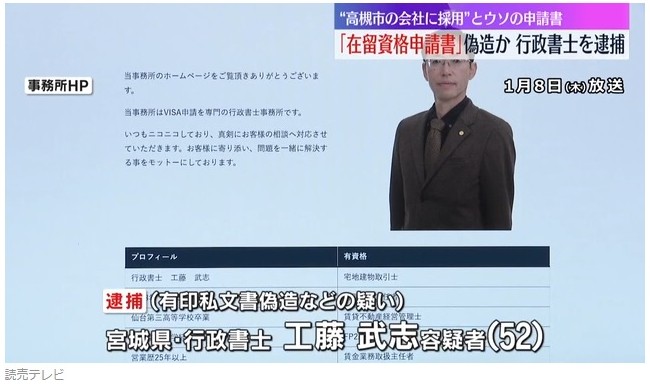逮捕容疑は、2024年10月から昨年8月にかけて、「経営・管理」の資格で在留する40代男性が代表社員となっている会社に実態がないことを知っていたにもかかわらず、在留資格更新時に提出する虚偽の書類を作成し、手助けした疑い。