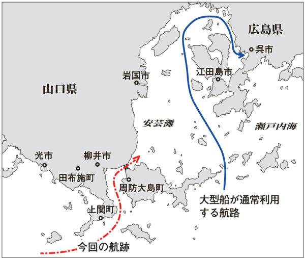 船舶が発信する位置情報をもとに航行ルートを公開している民間のホームページ「マリントラフィック」には、貨物船が関門海峡から広島県の呉市へと向かう航跡が記録されています。