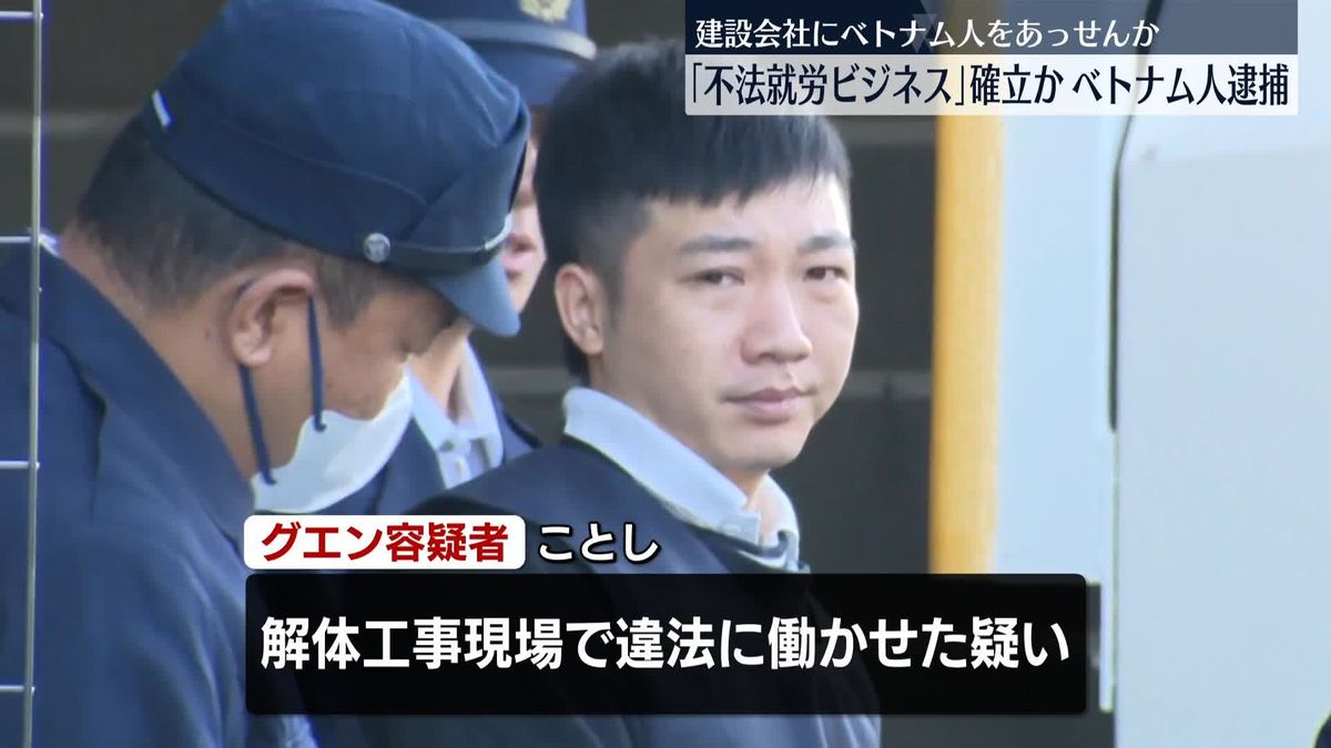 再逮捕容疑は7月22日ごろから9月11日ごろまでの間、業として、横浜市内の建設会社から請け負った同市内や東京都内の解体工事現場において、在留期間を経過して不法に日本に残留したベトナム人の男2人を解体工事現場の作業員として紹介し、不法就労活動のあっせんをした疑い。